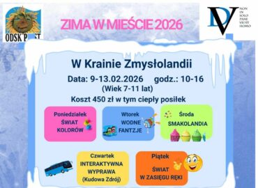 Zapraszamy do zapisów na półkolonie Zima w mieście – „W krainie Zmysłolandii”. Bliższe informacje na plakacie!Zapisy w linku;https://forms.gle/ikx13W45yULzJdEe6